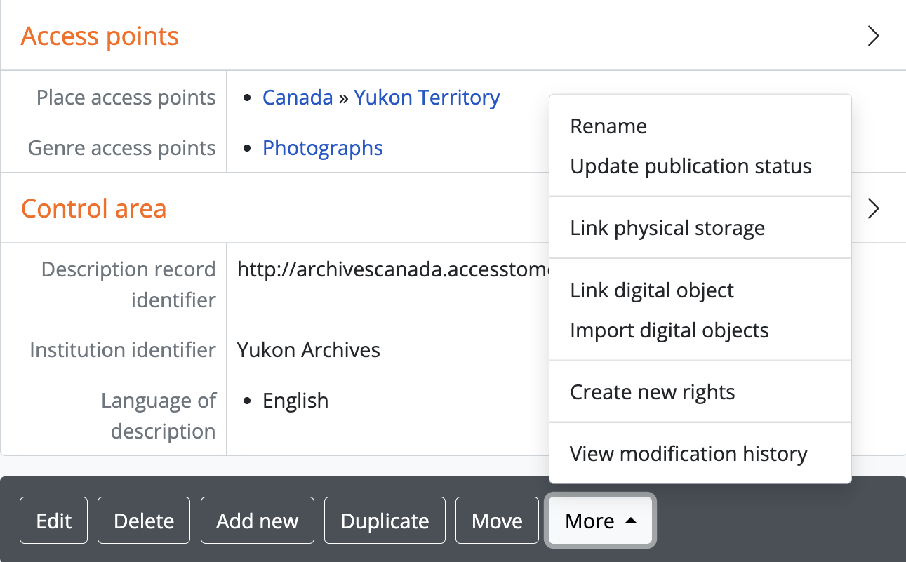 The options available in the button block depend on the possible actions associated with an entity or record type. For example, the button block on an archival description’s view and edit pages includes a “More” button that does not appear in any other button block throughout the application - when clicked, further user options are revealed, including: Link physical storage, Link digital object, and Import digital objects (actions which only relate to archival descriptions).