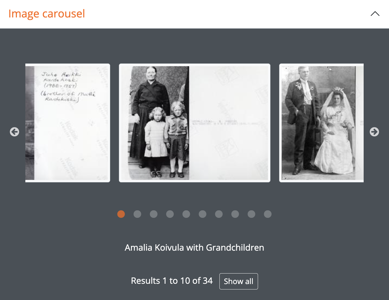 To enable the quick location of other core entity types such as authority records and archival institutions, the AtoM search box also implements typeahead. As a user enters text into the search box, one or more possible matches are found and presented to the user in a drop-down below the search box, which continue to narrow as the user enters further text. This allows a user to dynamically view results and select a resource without necessarily having to enter its full name or title. The search box typeahead results are organized into record-type categories (or facets), including: