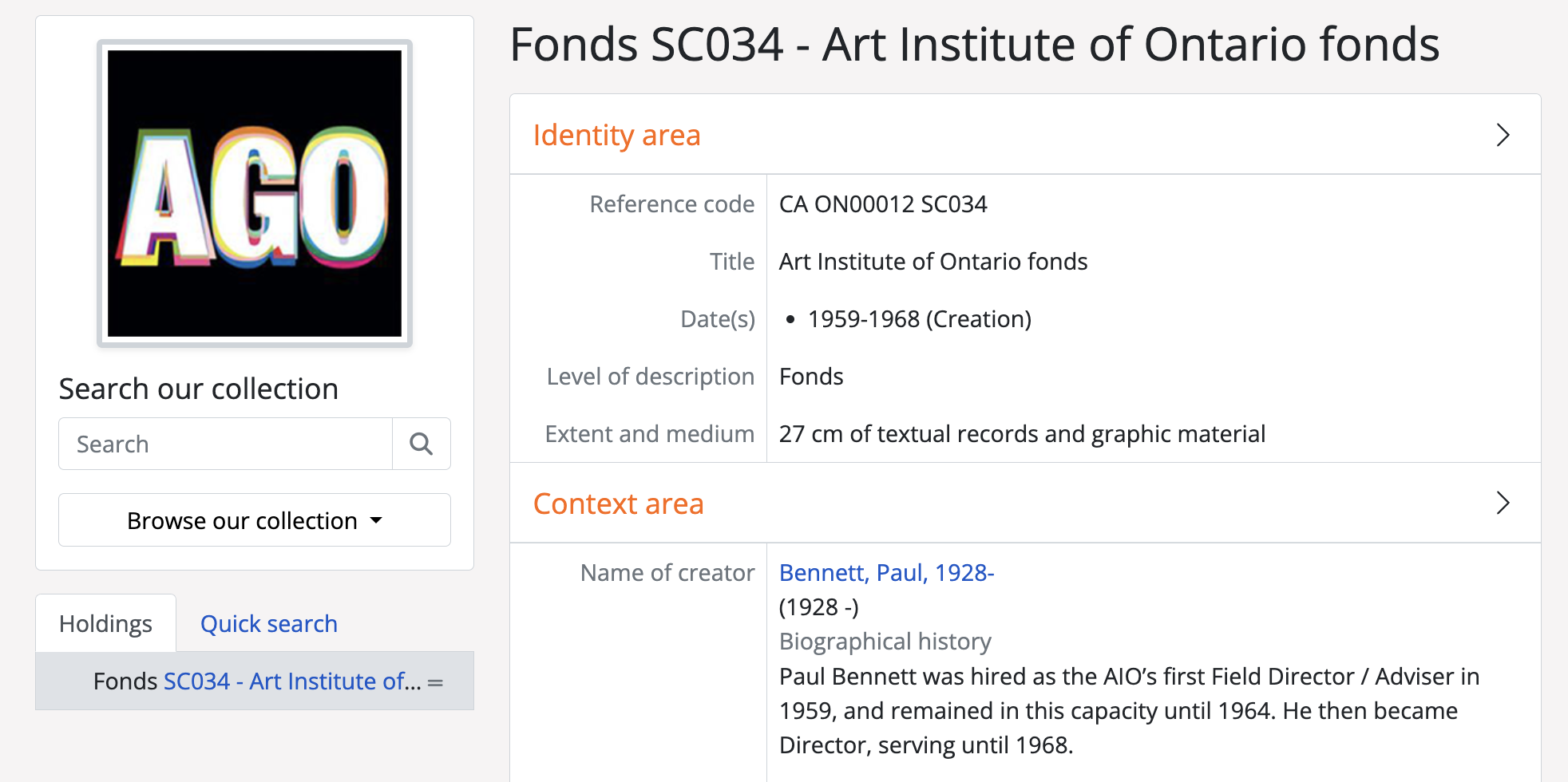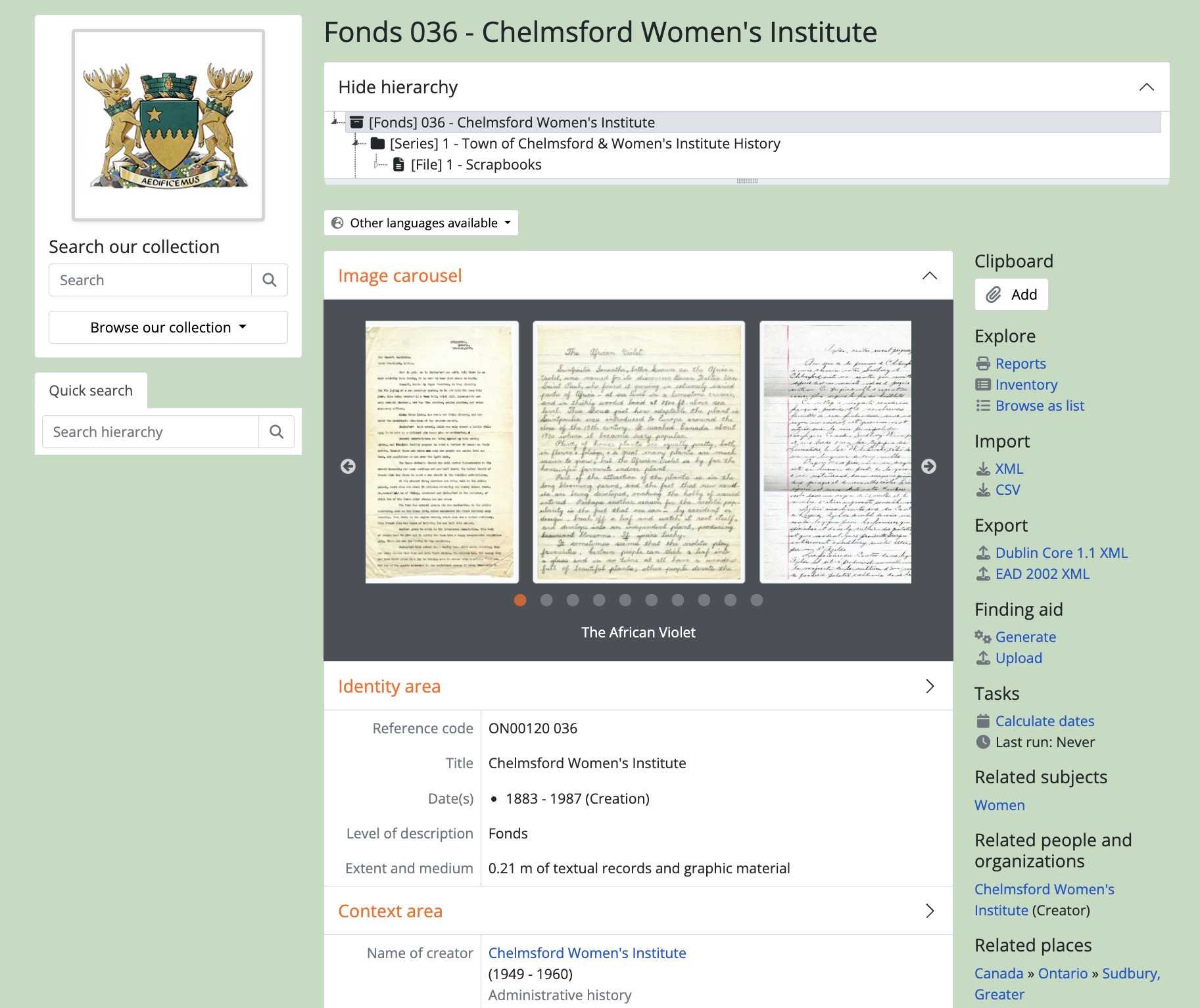 On archival institution records and related archival descriptions, the institution logo appears on in the top-left hand corner of the page, in the context menu. On related archival descriptions, it is positioned above the treeview; on the archival institution record page, it is positioned above the list of related holdings.