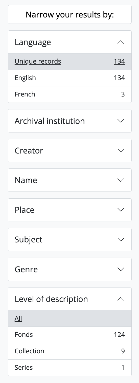 - When a filter is applied, all other facet filters are updated to provide filters that relate only to the results currently being displayed. For example, if you filter by Level of description to display only series-level archival descriptions, all other facets will only show results that relate to the series-level descriptions, until the first facet is removed.