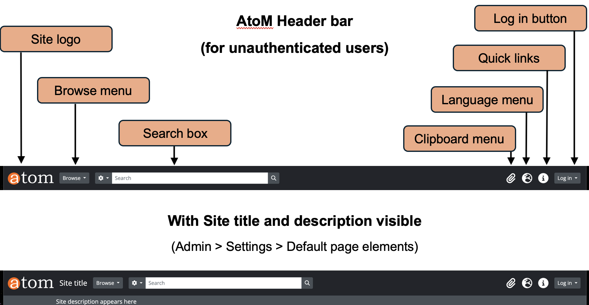 Additionally, an administrator can add a site title and a site description via Admin > Settings > Site information, and then determine whether or not these are visible in the header bar via Admin > Settings > Default page elements. The visibility of the site logo can also be controlled via Default page elements. For more information see Settings.