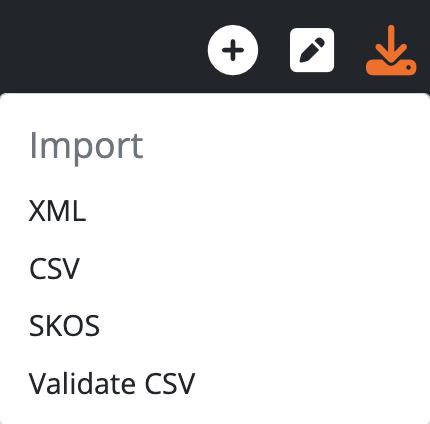 Three options are offered in the dropdown menu - XML (short for eXtensible Markup Language) and CSV (short for Comma-Separated Values), and SKOS (short for Simple Knowledge Organization System). Selecting one of the options from the Import drop-down menu will redirect the user to an import page specific to the format chosen. Using these options, an administrator can import descriptions and terms into AtoM.