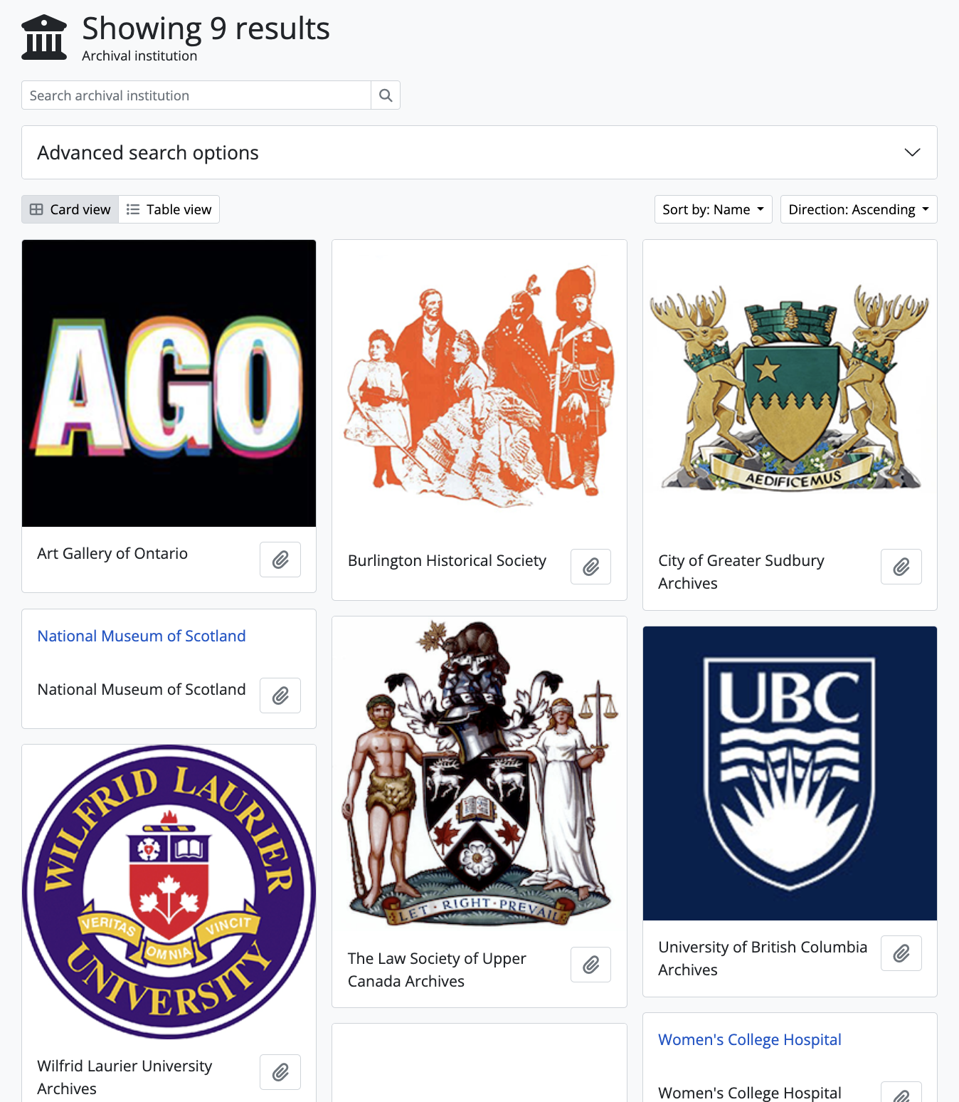 Institution logos on the Archival institution browse page. In the image, the National Museum of Scotland and Women’s College Hospital represent institutions without uploaded logos, showing placeholders instead.