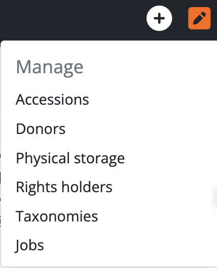 The Manage menu is distinct from the Browse menu (available next to the search box in the header bar), in that it offers users direct access to browse pages that are not available to unauthenticated (i.e. not logged in) users - public users who are not logged in cannot view accessions, donor records, physical storage locations, rights records, or access the full taxonomies list and the jobs page.