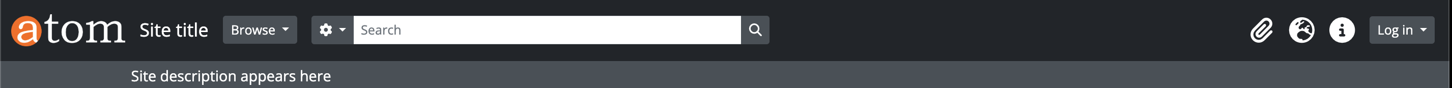 The site logo is the graphic that appears at the top of all pages in the left-hand corner of the header bar in AtoM. Clicking on the logo will take the user to the home page. AtoM ships with a default logo that can be replaced by administrators to theme the application to their own institution or network if desired: see Site logo.