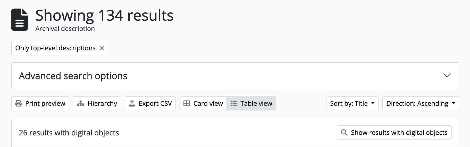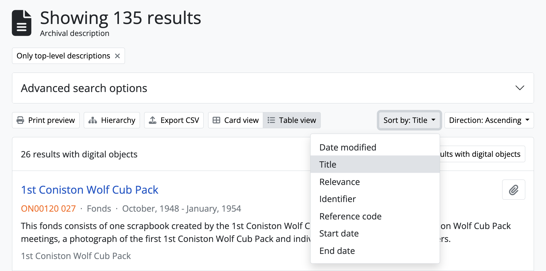 The sort buttons (Sort by and Direction) are navigational tools that appear on some browse and search pages throughout AtoM. They allow a user to change the sort order of the results being displayed. Common values used in the Sort by button as it appears in AtoM include: Title, Relevance, Identifier, Reference code, Date Modified or Start date and End date. The Direction sort button reverses the direction (ascending or descending) of items according to the Sort by option.