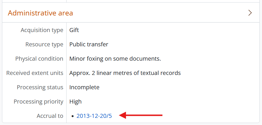 - When viewing the accession record for the accrual, you will notice that in the Administrative information area an “Accrual to” data field shows the related original accession record. The data is a hyperlink that can be clicked to navigate to the original accession record.