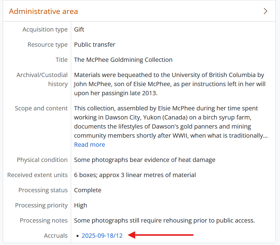 - Alternatively, if a User views the original accession record, in the Administrative area an “Accruals” data field shows the related accrual.