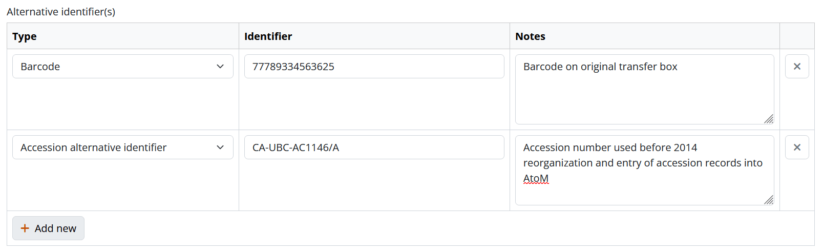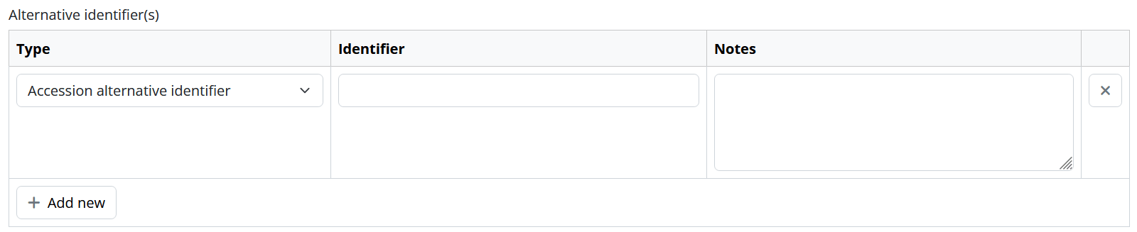 In addition to the primary accession number, you can also add additional alternative identifiers from the edit page of an accession record. This can be useful for capturing legacy identifiers, transfer IDs, conservation treatment numbers, barcodes, and more. You can add multiple alternative identifiers, and each can be assigned a type (using terms managed as a user-editable controlled vocabulary in a taxonomy) and an accompanying free-text descriptive note.