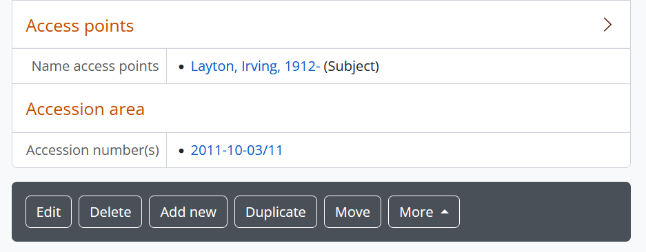 Archival descriptions that are created from an accession record will have a hyperlink to their related accession record. The hyperlink is located in the “Accession” information area at the bottom of the archival description view page.