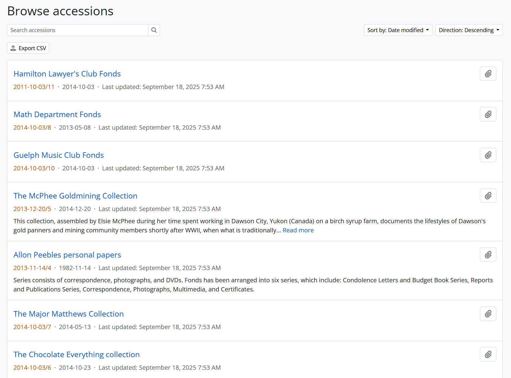 Access content - AtoM will redirect you to the accession record browse page. Select the record you want by clicking on the hyperlinked accession title. You can also search for an accession record with the accession records search box located at the top of the browse page. For more information on searching for accession records in AtoM, see: Searching for accession records.