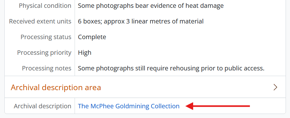 - A link to the original accession record is maintained in the Accession information area in the archival description. Similarly, a link to the archival description is added to the related accession record. These are hyperlinks; clicking them in either record will take the user to the related record.