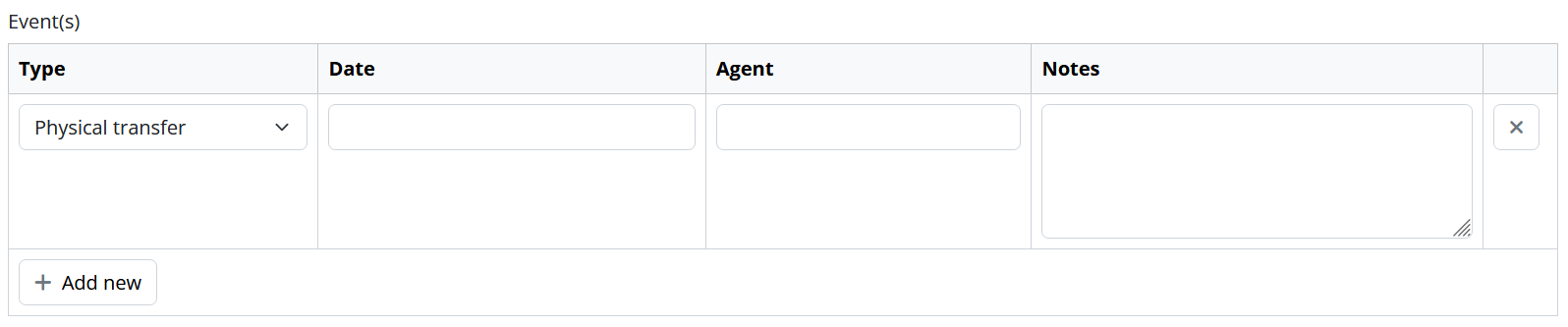 The entire block of related fields can be repeated as needed to capture additional events, by clicking the “Add new” link below the list of fields. You can also remove a row of related fields by clicking the X to the right of the field block.