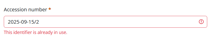 - If you attempt to use a value for the Accession number that is not unique (i.e. is already in use by another accession record), AtoM will provide a warning, and will not allow the record to be saved until the Accession number is edited and a unique value is added.