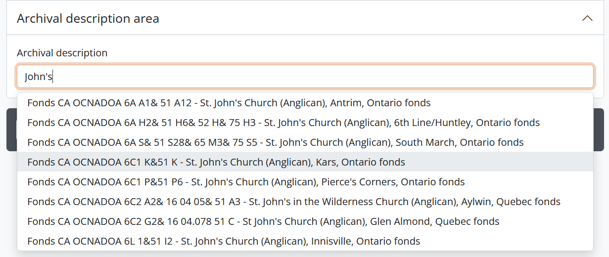 Users can link an accession record to a fonds/collection level archival description or lower levels of description including sous- fonds, series, sub-series, and files. You can link to multiple archival descriptions as needed by repeating the steps above.