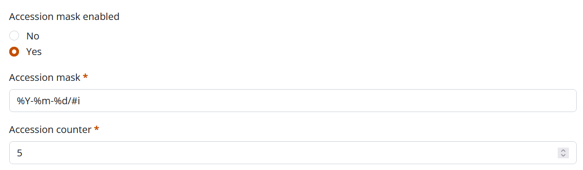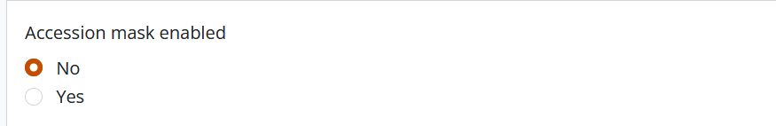 The accessions mask is provided to help users apply consistent and unique identifiers to accessions. Users always have the ability to edit the pre-populated values provided by the accessions mask when creating a new accession record.