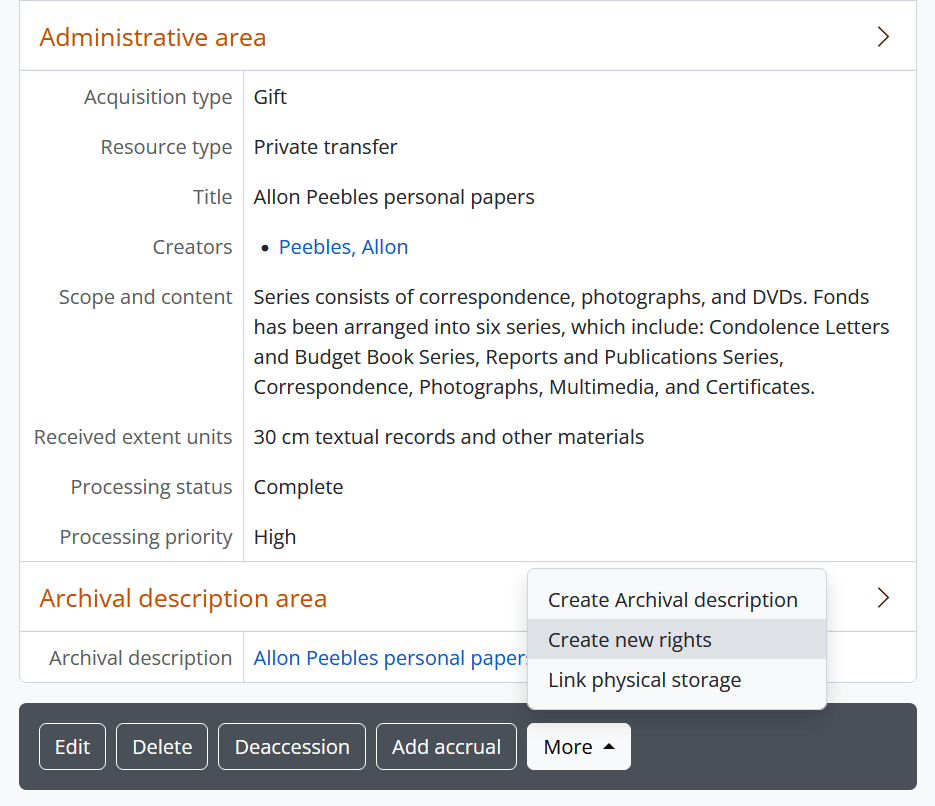 Name access points (drawn from creators) and Rights added to the accession record are also inherited into the archival description.