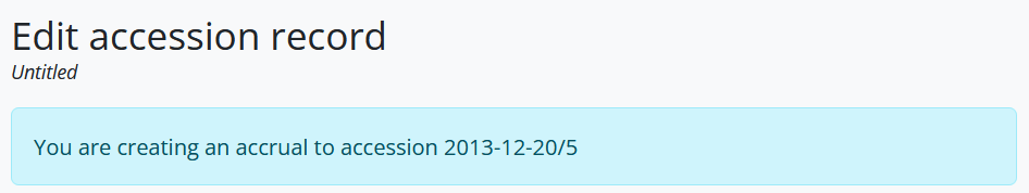 - You will be redirected to an accession record edit page, but but at the top of the edit template a message will read: “You are creating an accrual of the accession <Number>” (where <Number> represents the Accession number to which you are adding an accrual)