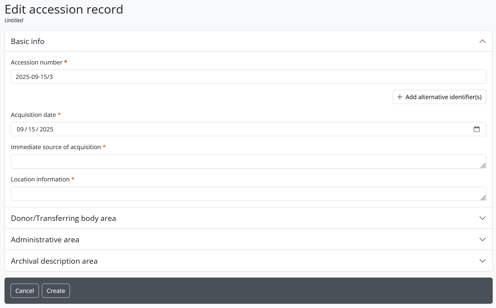 - Click the “Create” button in the button block to create and save the new accession record. If you do not want to keep the record you can click the “Cancel” button and remove the record.