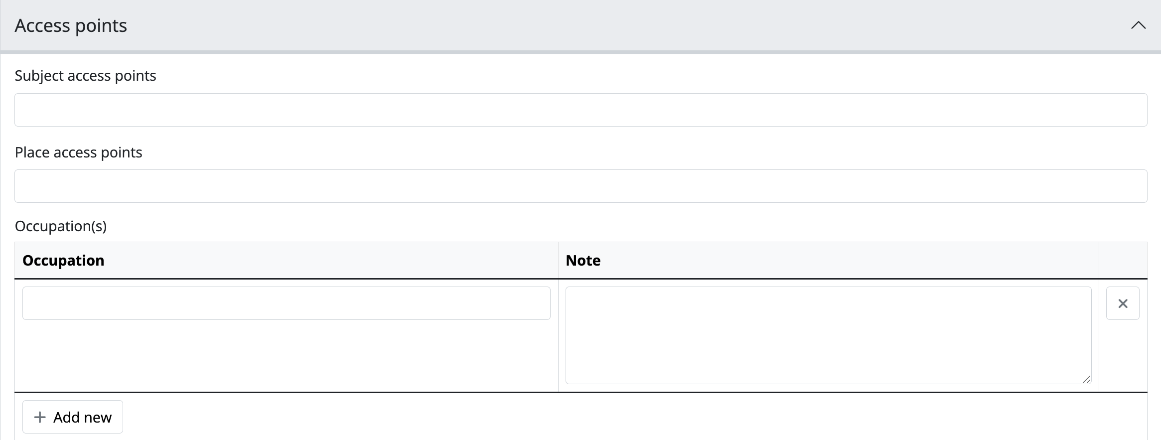 Each of the three access points includes an autocomplete field linked to the relevant taxonomy. The occupations entry also includes a free-text note field, where you can add further context specific to the person, family, or corporate body described in the related authority record.