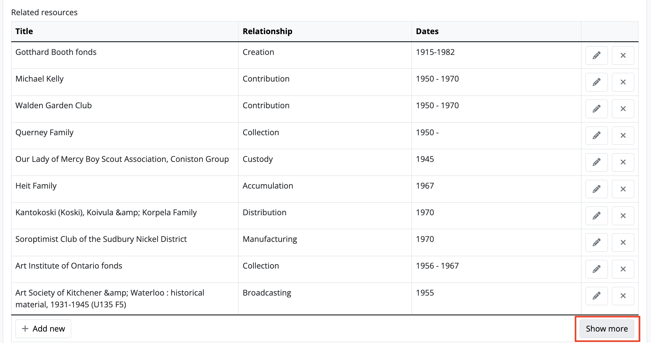 - The related archival description will now appear in the Related resources table of the Relationships area. Click the pencil icon to re-open the pop-up dialog and edit the relationship, or click the X icon to remove the relationship link. You can also repeat this process to add multiple links by clicking the “Add new” button below the Related resources again - AtoM will open a new pop-up dialog. Repeat steps 3-7 as needed. If more descriptions have been linked than the global results per page setting (which defaults to 10 in new installations), AtoM will add a pager - you can click “Show more” button below the list of linked descriptions to load the next set