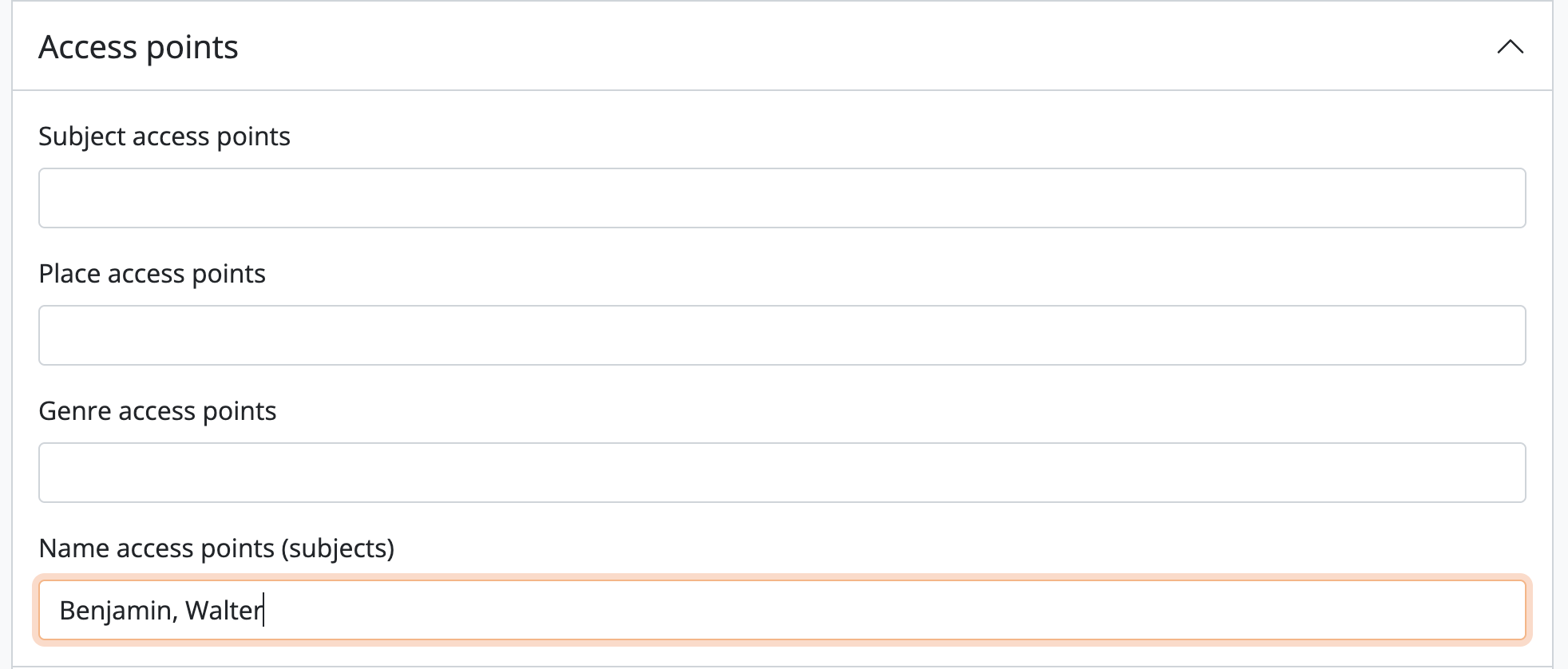 This field can be used to create an authority record for a person, family, or corporate body who is the subject of an archival description, but not its creator. Type a new name into a Name access point field. When you save the archival description record, AtoM creates a new authority record for the name.