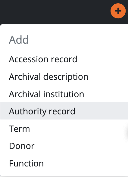 To create new authority records, you must be logged in to AtoM with a user account with sufficient edit permissions to create authority records, such as an administrator, editor, or contributor. For more information on types of users and edit permissions, see User roles
