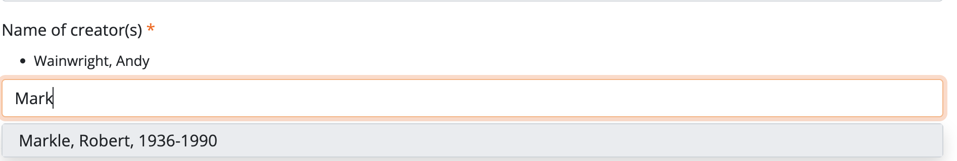 - To create a link to an authority record for a creator, follow the steps above for adding a new creator - however, instead of entering a new name, begin typing the name of the authority record to which you would like to create a link. The name field is an auto-complete - as you type, matching results will load in a drop-down menu below the field. When you see the authority record you would like to link, click on it to select it.