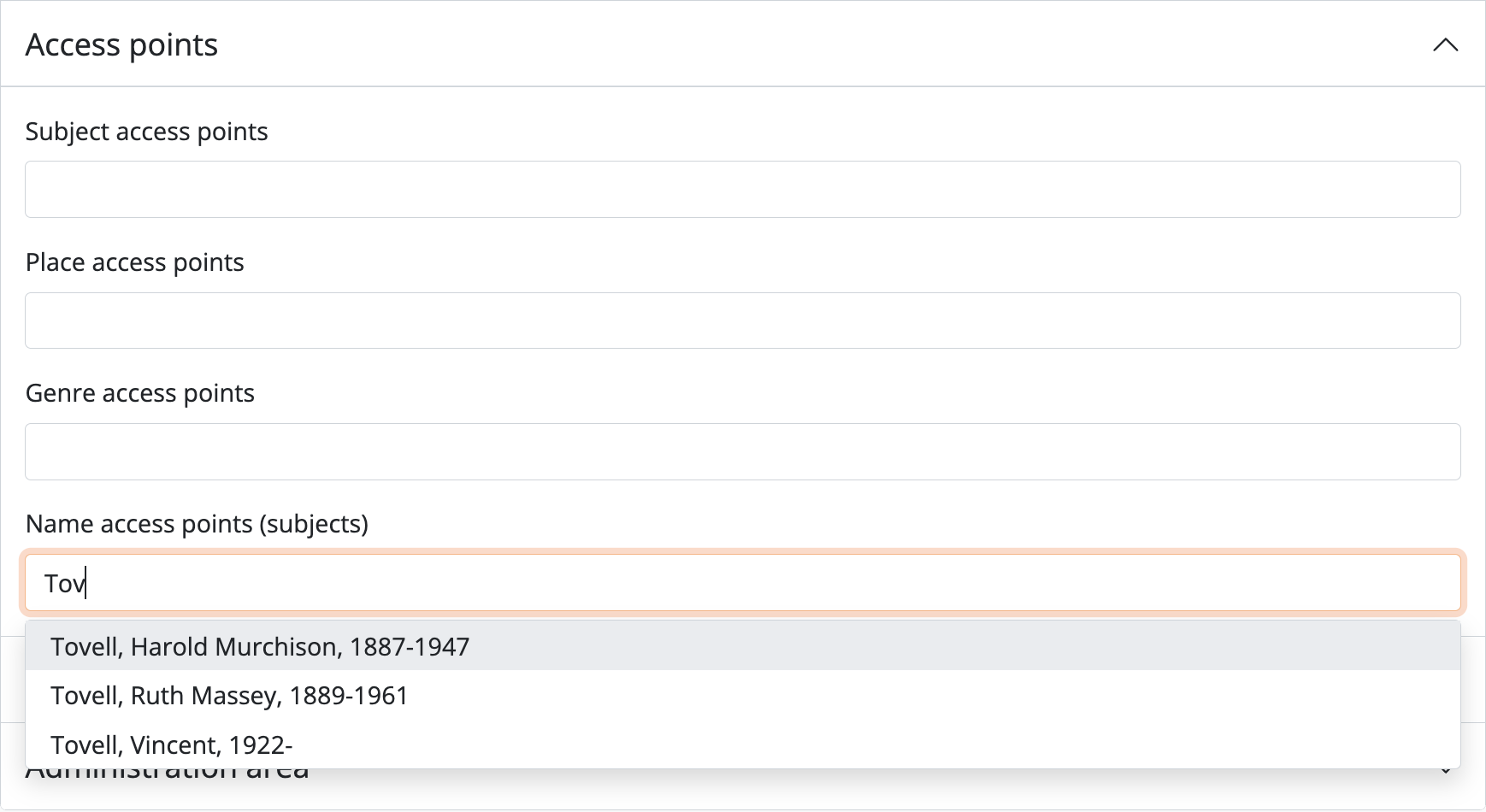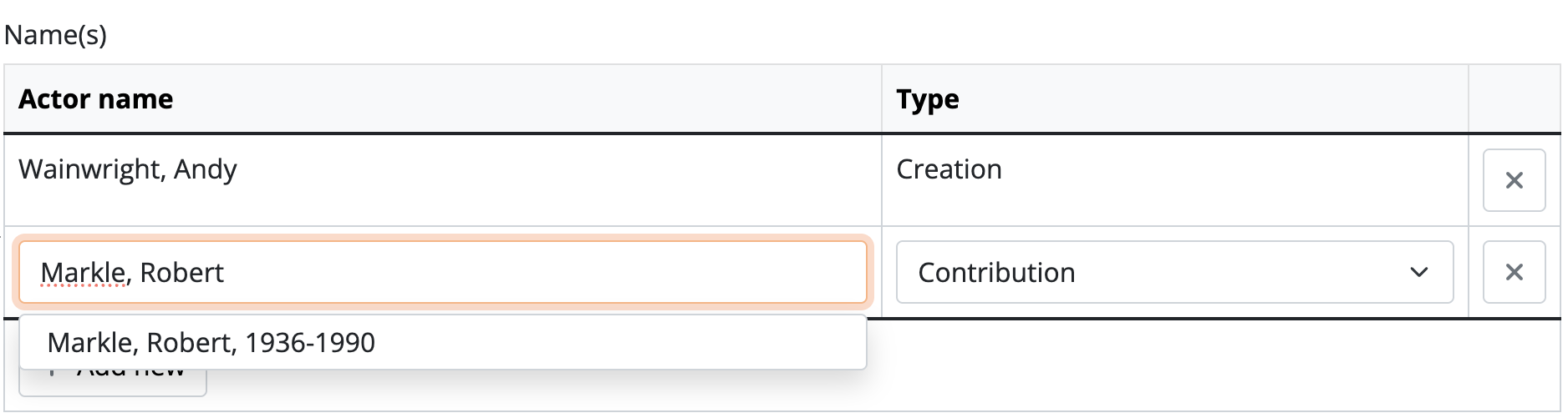 - Whenever a new name is added to a description (either as a creator, or as a name access point), a new stub authority record is automatically generated for that person, family, or corporate body, which can then be supplemented by navigating to the authority record itself. The new authority record is linked to the archival description, and the new name will now appear in the autocomplete drop-downs when a user starts typing to add any other creator names or name access points in subsequent descriptions.
