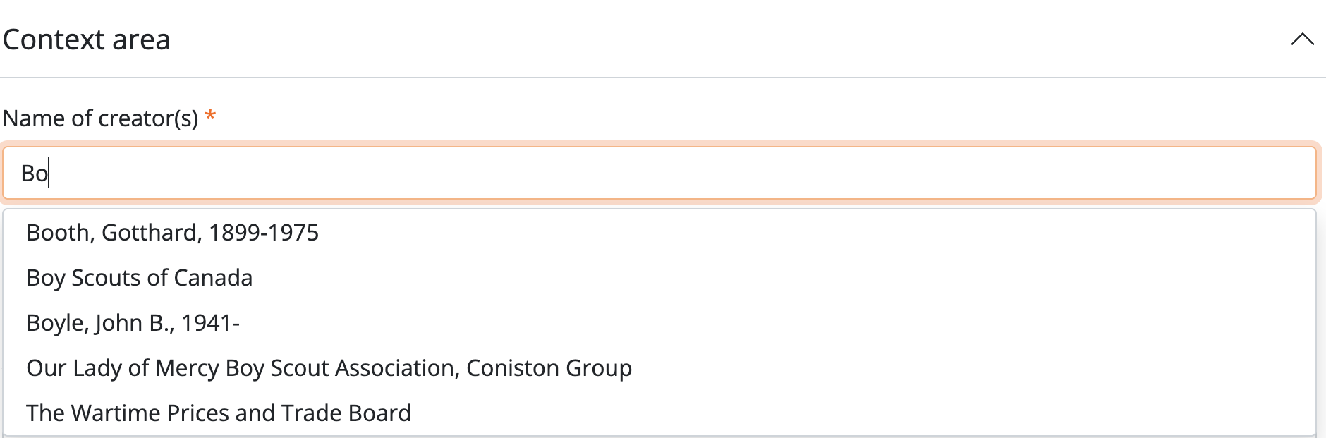 The creator name fields in AtoM are auto-complete fields - as you type AtoM will look for matches in the existing authority records. If you type a name quickly and press enter or move away from the field, AtoM will create a new authority record instead of linking to an existing one, even if you have entered the name identically to an existing one. If you are intending to link to an existing authority record instead of creating a new one, be sure that you wait for the autocomplete and select the matching record from the drop-down menu! For more information on linking to an existing authority record, see below: Link an existing authority record to an archival description