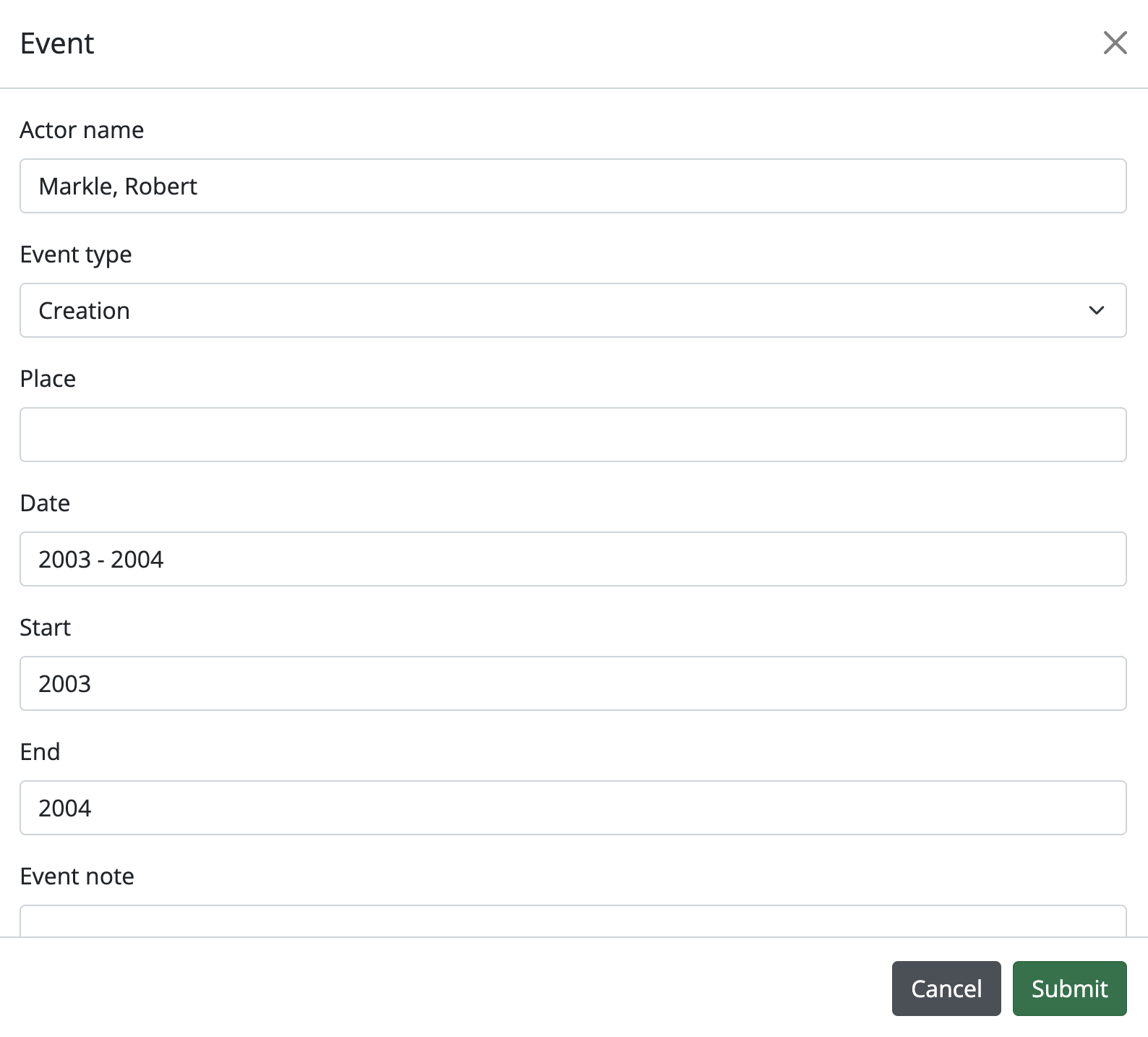 - A dialog will appear with several fields, including “Actor name,” “Event type,” “Date,” etc.
