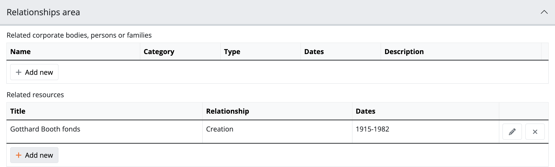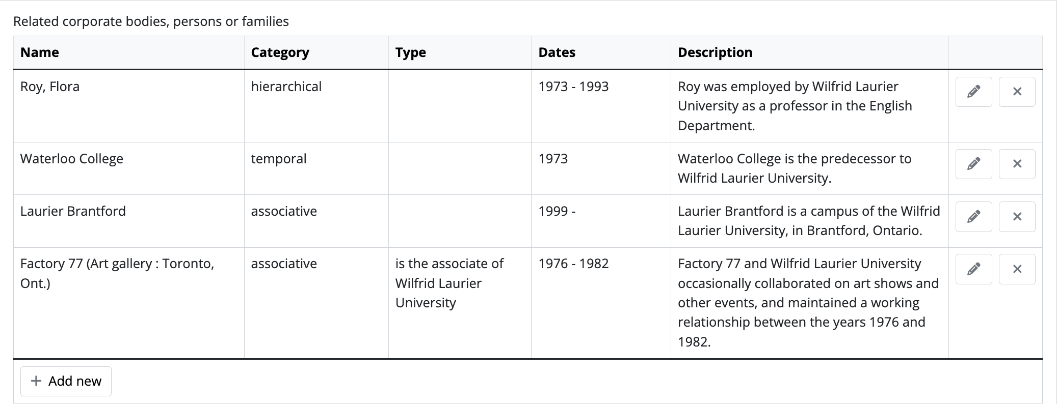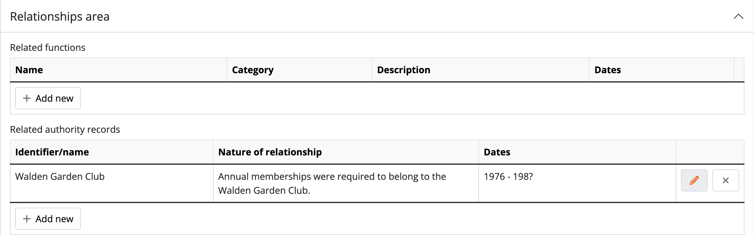 - The related authority record will now appear in the Related authority records table of the Relationships area. Click the pencil icon to re-open the pop-up dialog and edit the relationship, or click the X icon to remove the relationship link. You can also repeat this process to add multiple links by clicking the “Add new” button below the Related authority records again - AtoM will open a new pop-up dialog. Repeat steps 3-6 as needed.