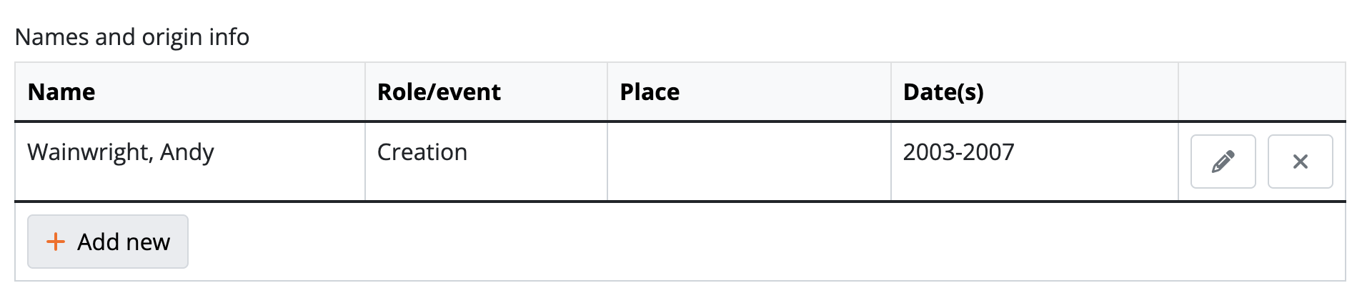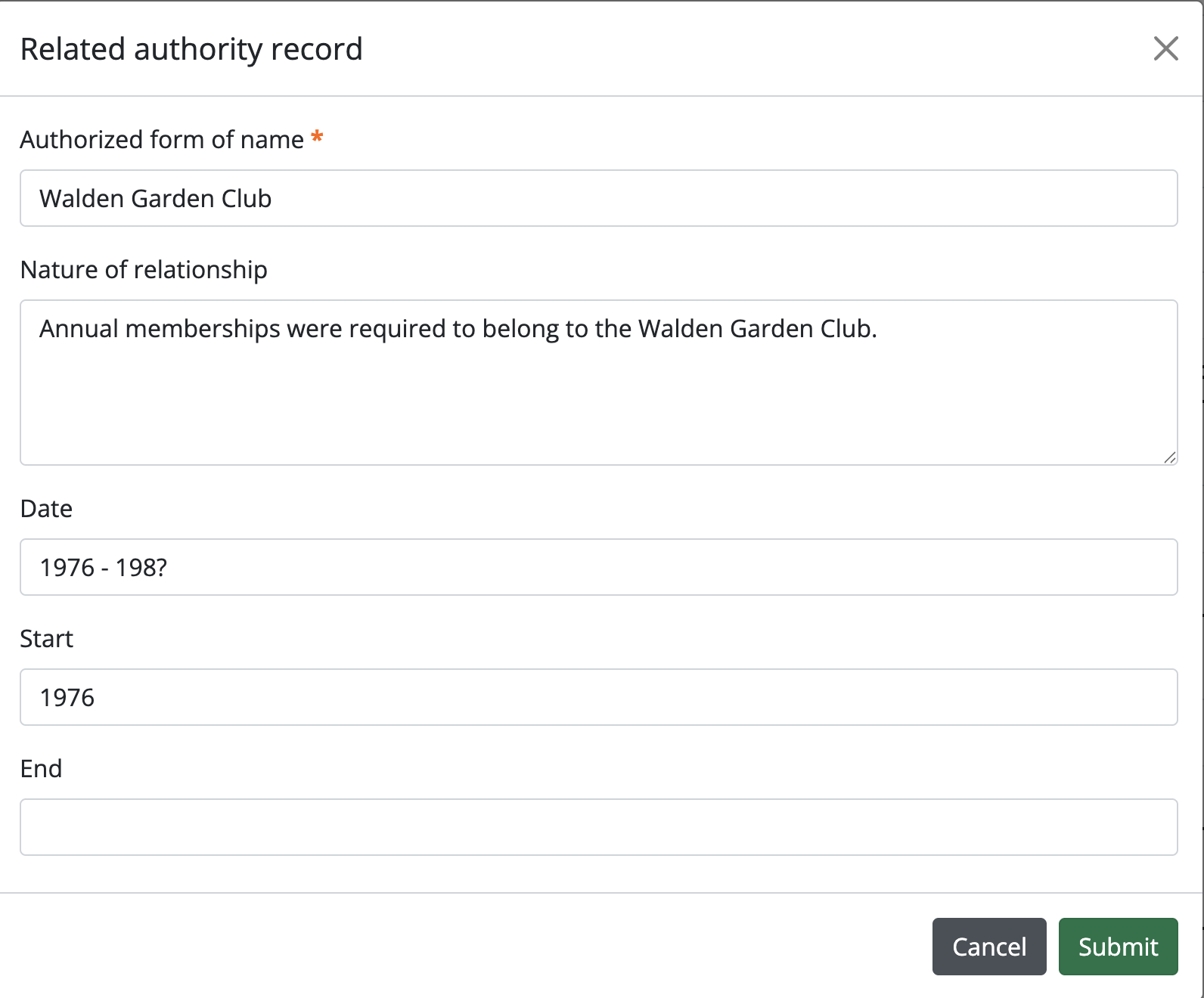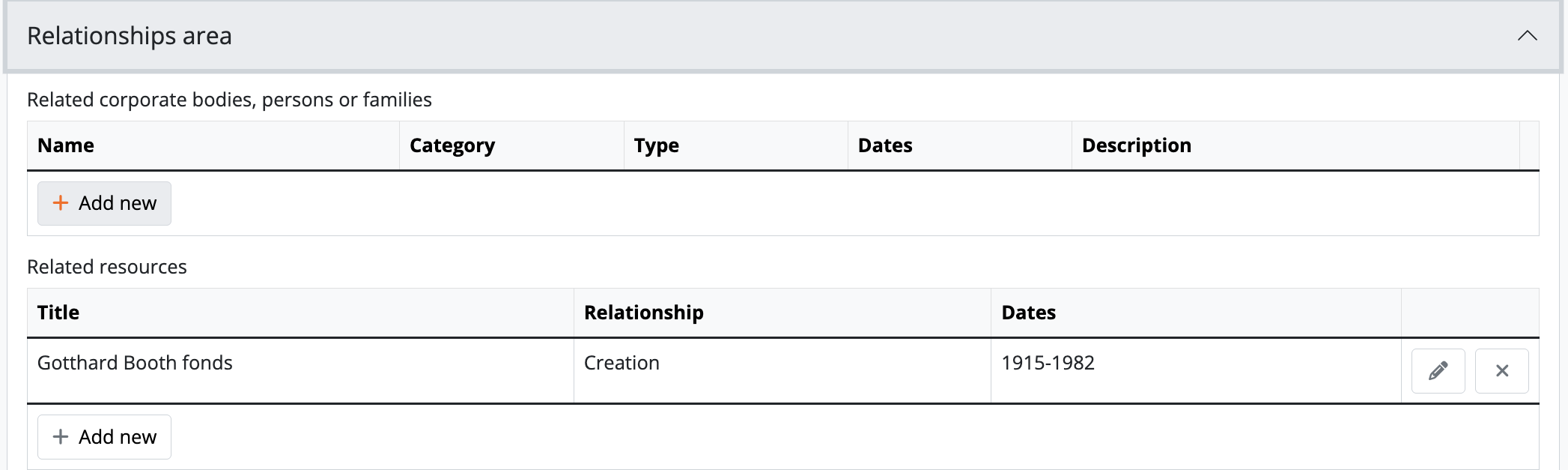 - The related authority record will now appear in the Related authority records table of the Relationships area. Click the pencil icon to re-open the pop-up dialog and edit the relationship, or click the X icon to remove the relationship link. You can also repeat this process to add multiple links by clicking the “Add new” button below the Related authority records again - AtoM will open a new pop-up dialog. Repeat steps 3-6 as needed.