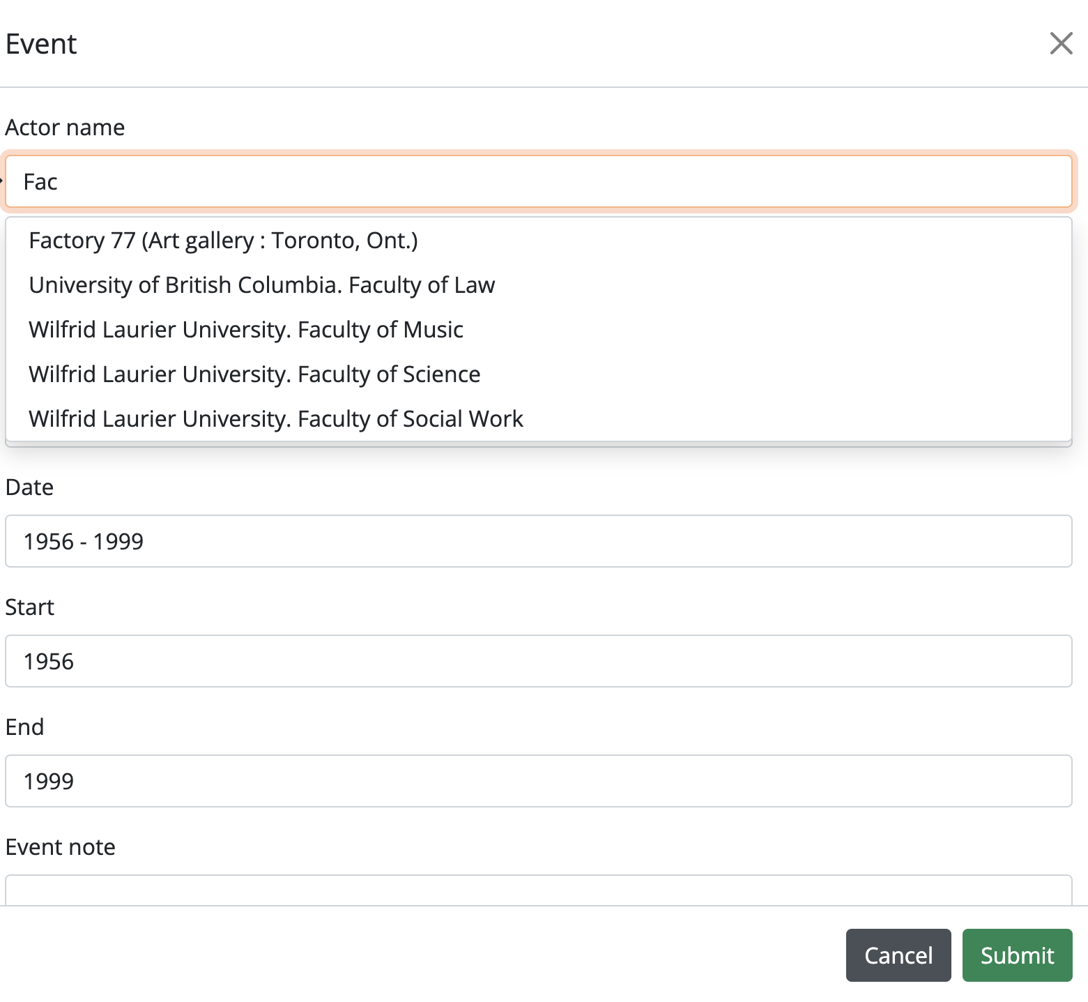 - Enter a new name in the “Actor name” field of the pop-up dialog, and then click “Submit”. The name will be saved as a new authority record when you save the archival description.