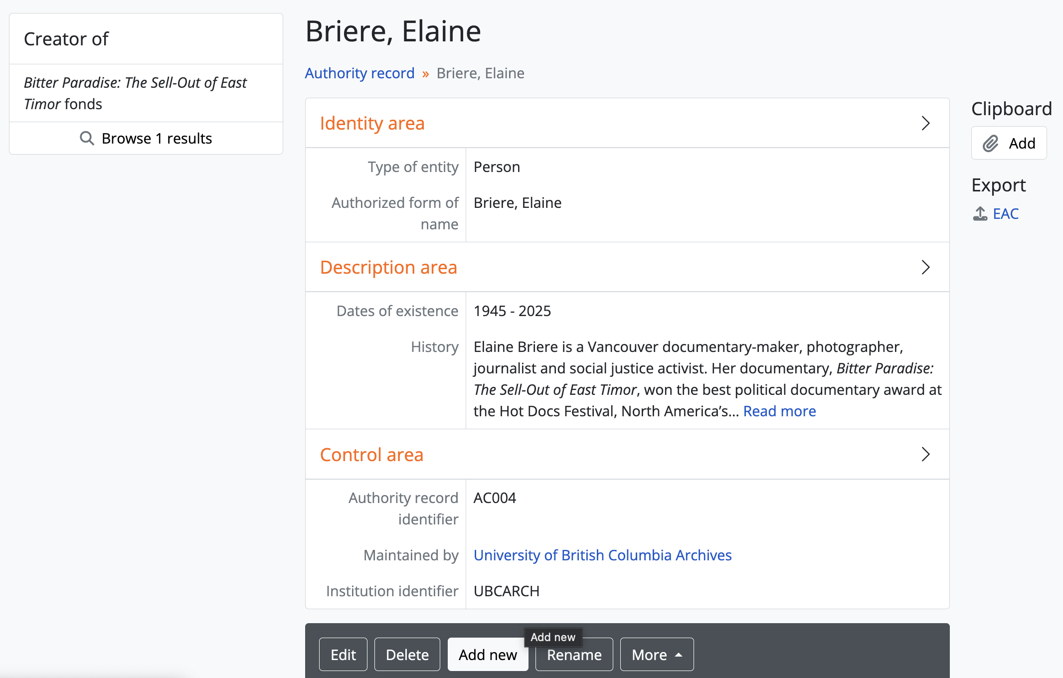 A new authority record can also be added to AtoM from the view page of any other authority record via the “Add new” button in the button block. To do so: