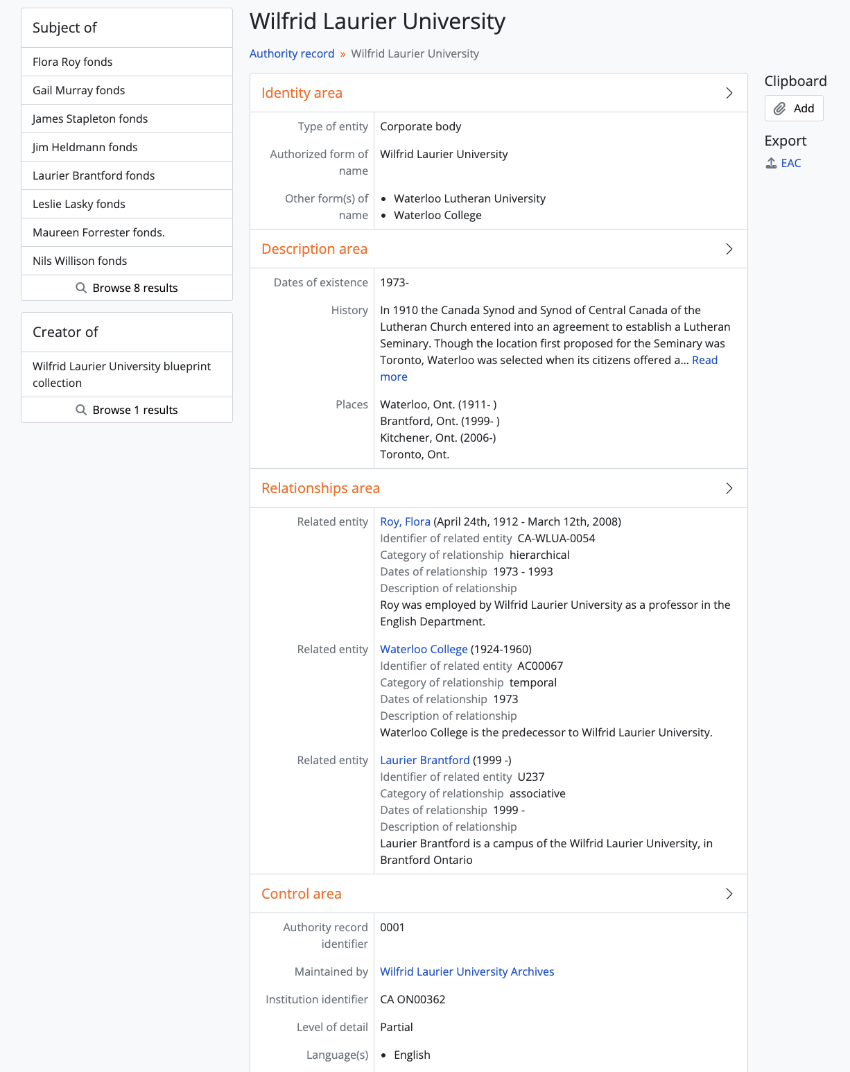 - When you are finished, scroll down to the button block at the bottom of the edit page and click the “Save” button. AtoM will reload the page in view mode so you can review your work. The related repository will be displayed as a hyperlink in the Control area of your authority record.