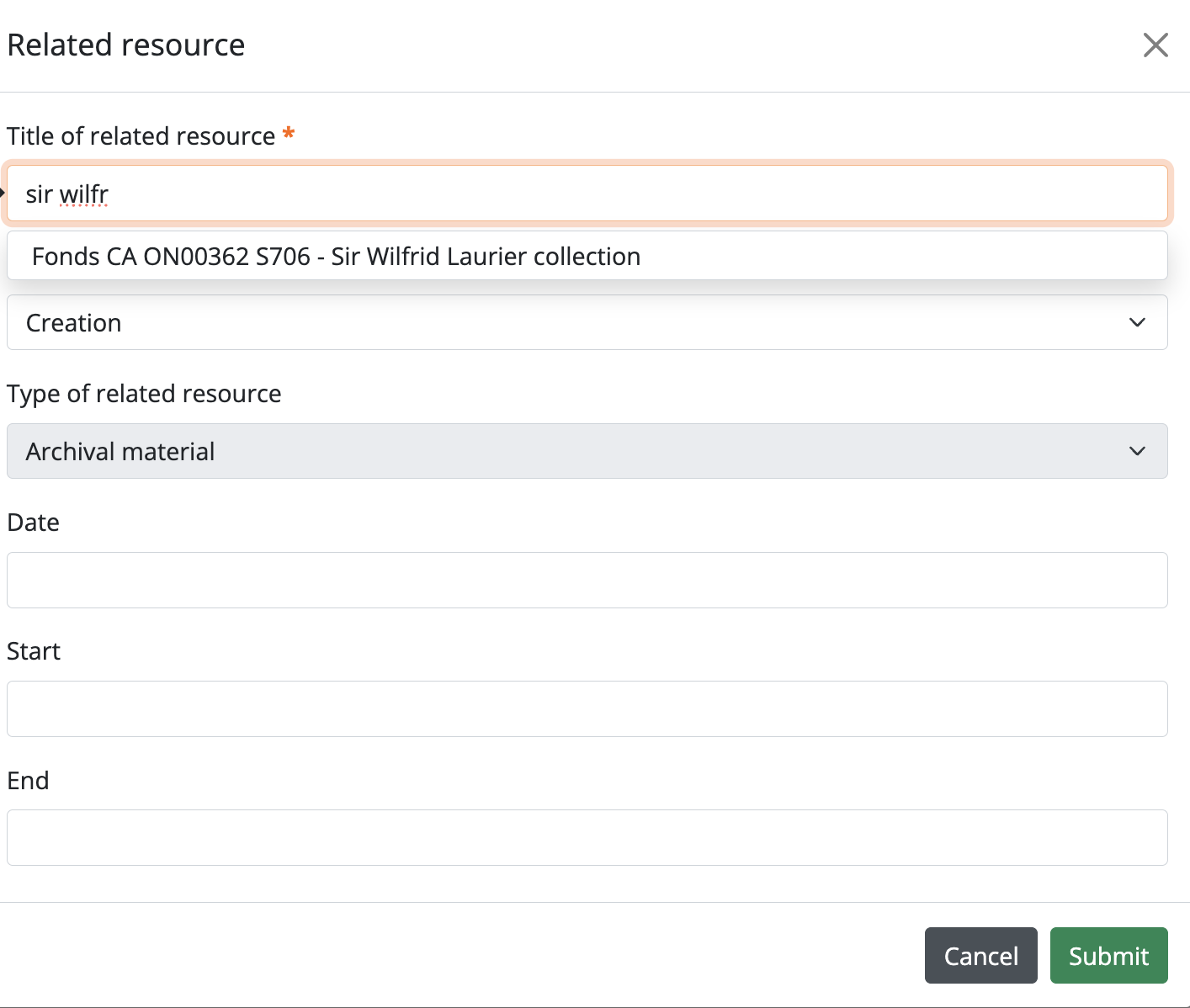 - The first field in the pop-up dialog, “Title of the related resource,” is an auto-complete field: as you type, matching results will load in a :term :drop-down menu below the field. When you see the archival description you would like to link, click on it to select it.