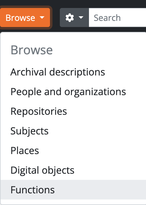 - Navigate to the function you would like to relate to an authority record. You can do this by going to the Browse page for functions (Browse > Functions) and then either browsing through the list, or using the dedicated Functions search bar on the Browse functions page to find the related function. Click on the related function to navigate to its view page. For more information on browsing and searching in AtoM, see: Browse or Search.