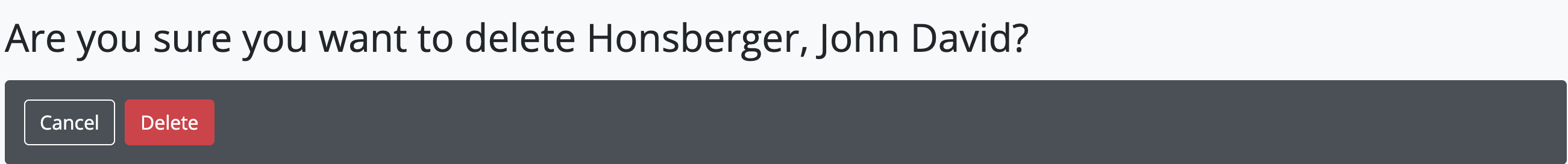 - AtoM prompts you to confirm the delete request: click “Delete” to proceed (or you can click “Cancel” to return to the authority record’s view page).