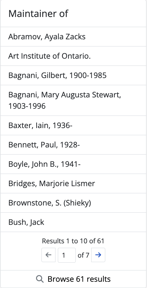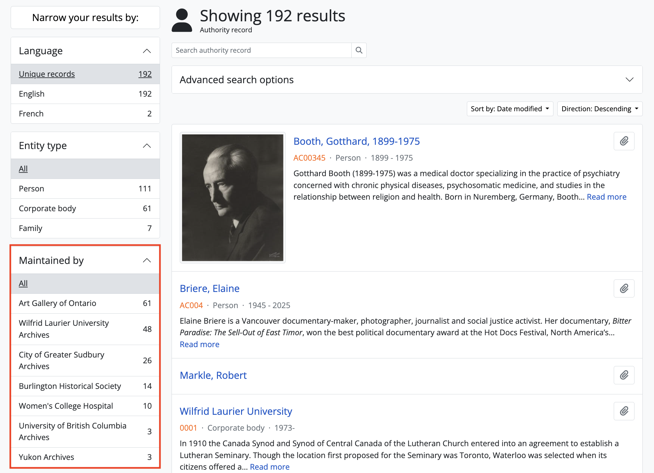 When a link is created between an authority record and a repository, it will additionally appear as a facet filter on the authority record browse page, and in the list of maintained authority records visible on the archival institution’s browse page: