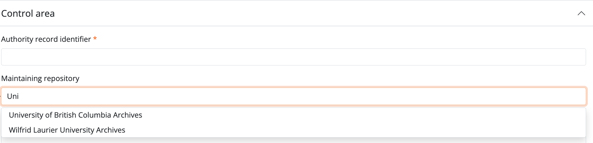 - The field is an auto-complete drop-down menu - it will show the first 10 repository records in the drop-down menu by default. You can also begin typing the name of a repository to find it - as you begin to type, AtoM will update the auto-complete results to show repository records that match. Select the matching repository to which you want to link your authority record from the drop-down list.