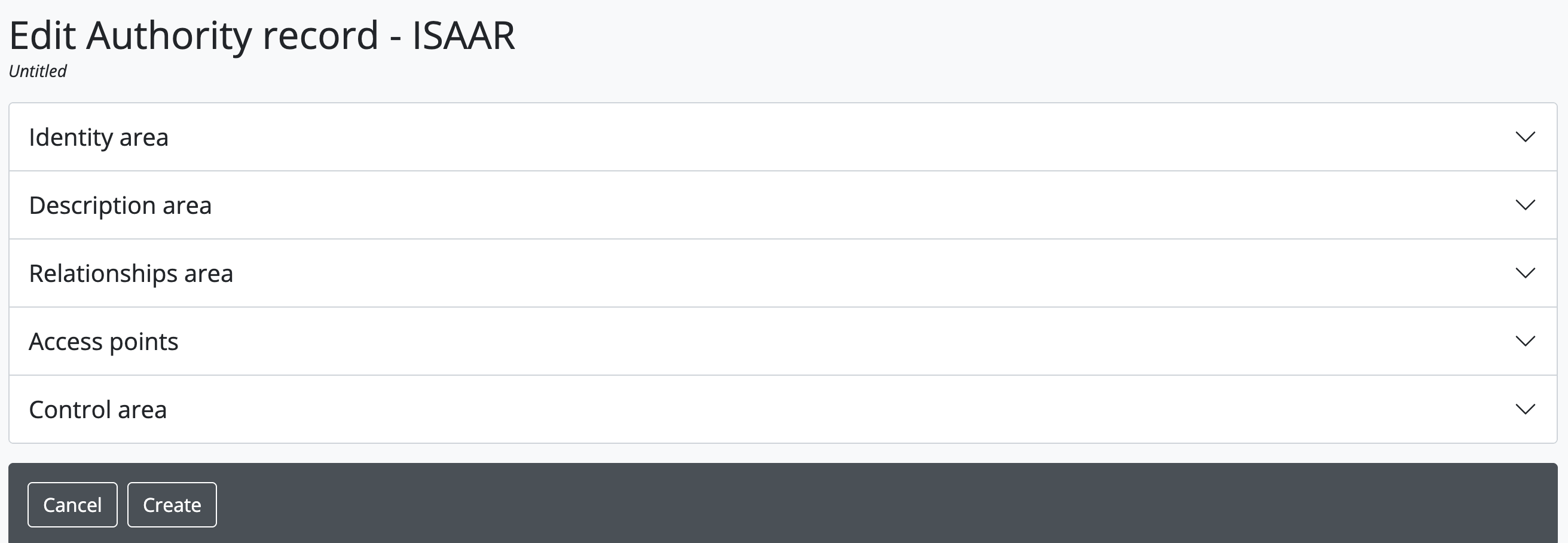 In AtoM, the data elements used to describe authority records are based on the ICA’s International Standard Archival Authority Record for Corporate Bodies, Persons and Families, or ISAAR(CPF).