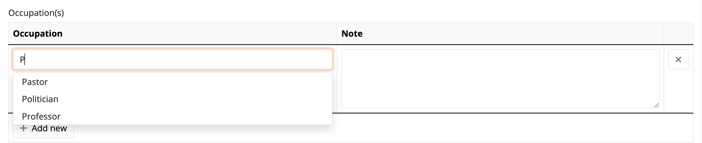 - The “Note” field available for Occupation access points is a free-text field where you can add further contextual information specific to the current person, organization, or family being described. This note data is not stored in the Actor occupations taxonomy - it is only associated with the current authority record.