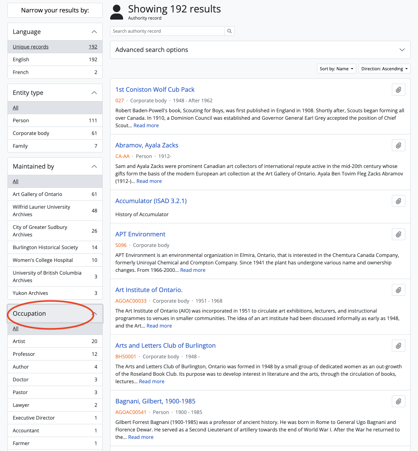 Once access points have been added to your authority records, they will show up as a facet on the authority record browse page. The following example shows the occupation taxonomy: