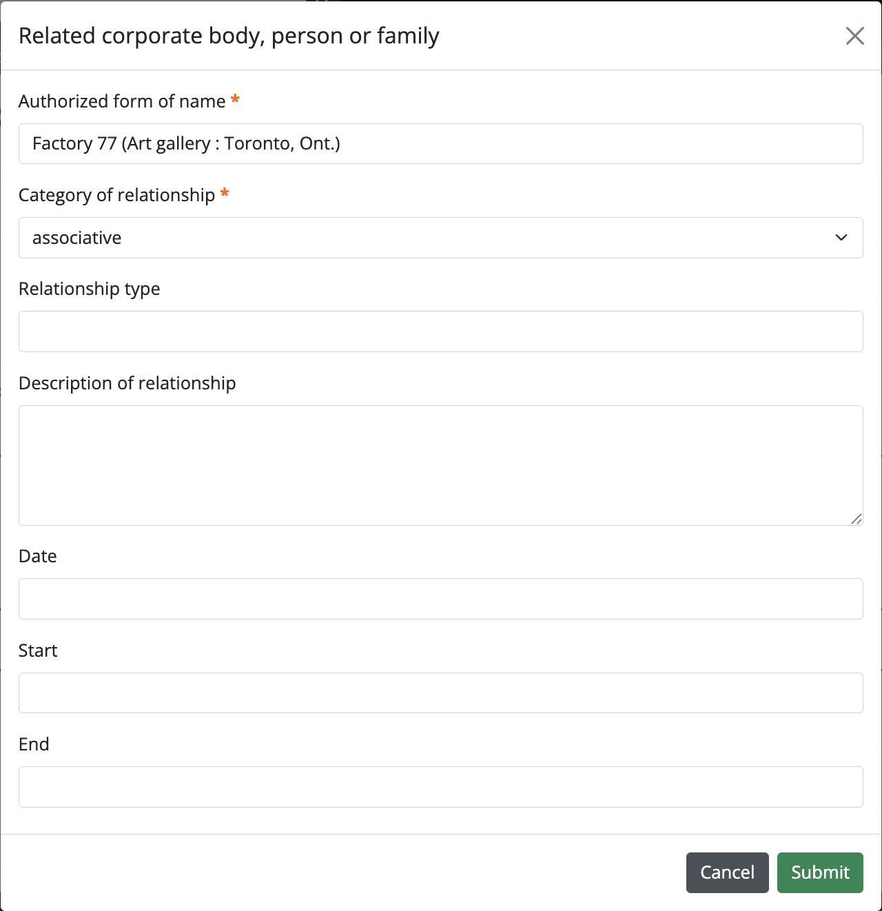 - AtoM will open a pop-up dialog where you can select the related authority record and define the nature and time frame of the relationship.