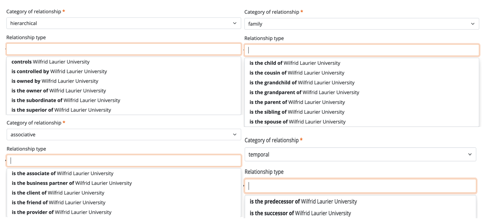 - The “Relationship type” field is pre-populated with default terms, pictured in the image below. These terms can be edited and managed in the Actor Relation Type taxonomy, and new terms can be added as well. For more information on managing terms, see: Terms; see specifically Add/edit a converse term.