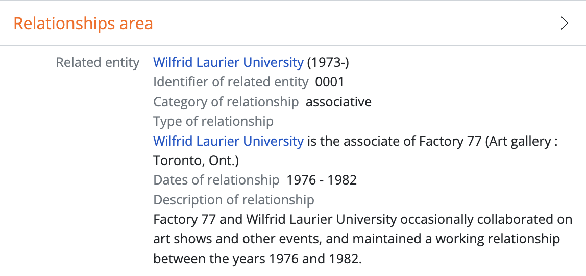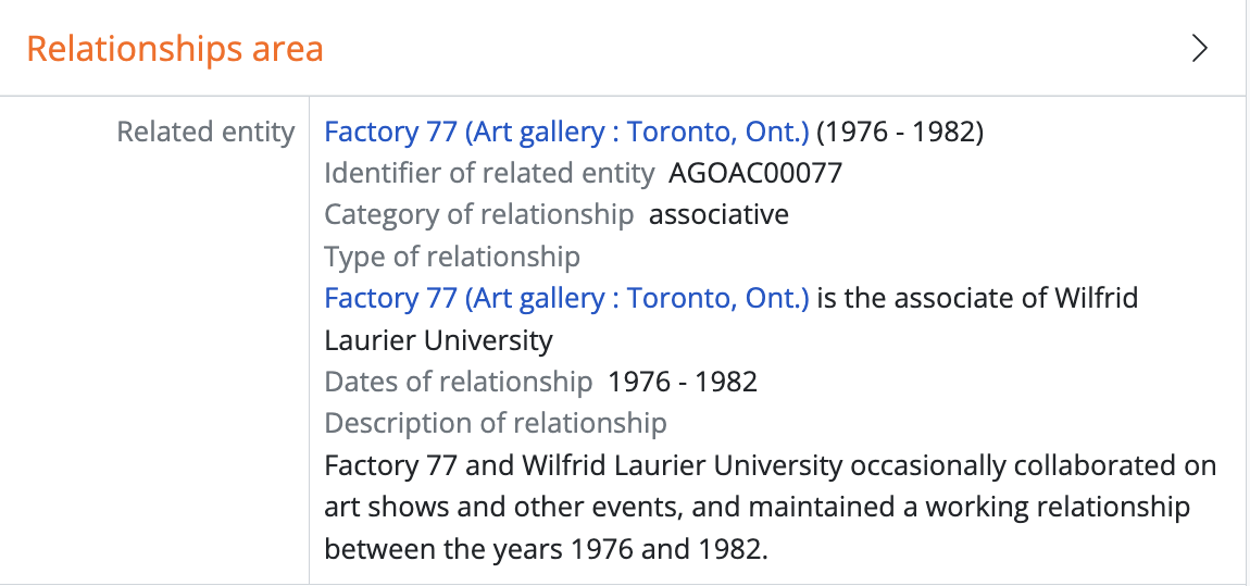 - AtoM will reload the authority record in view mode. relationship is expressed in the “Relationships” information area of the authority record’s view page, and the related record’s name will appear as a hyperlink.