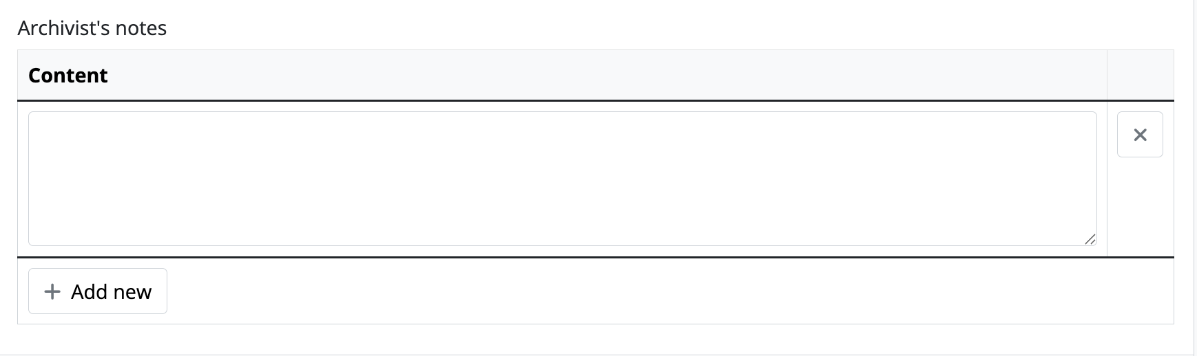 This element appears only in the ISAD(G) and DACS archival description templates. This is a text field; AtoM does not structure the data in any predetermined way. There is no limit to the number of notes you can add.