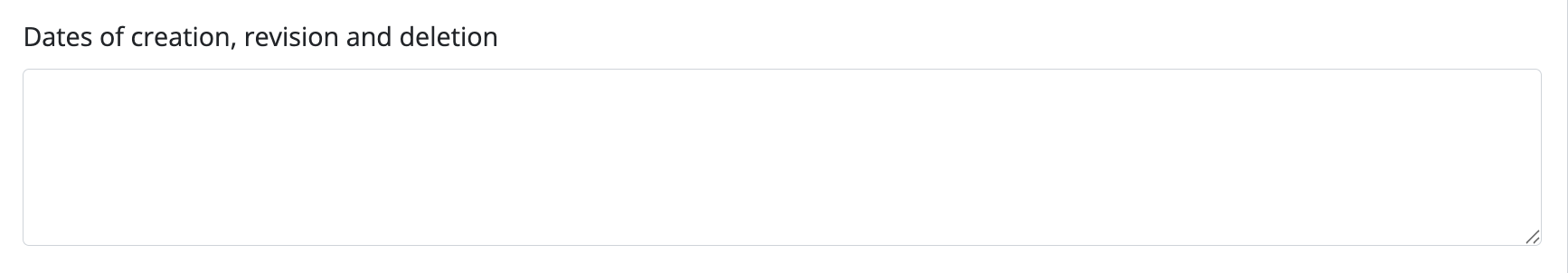 “Record the date the description was created and the dates of any revisions to the description.” ISDIAH 5.6.6, ISAAR 5.4.6, ISDF 5.4.6