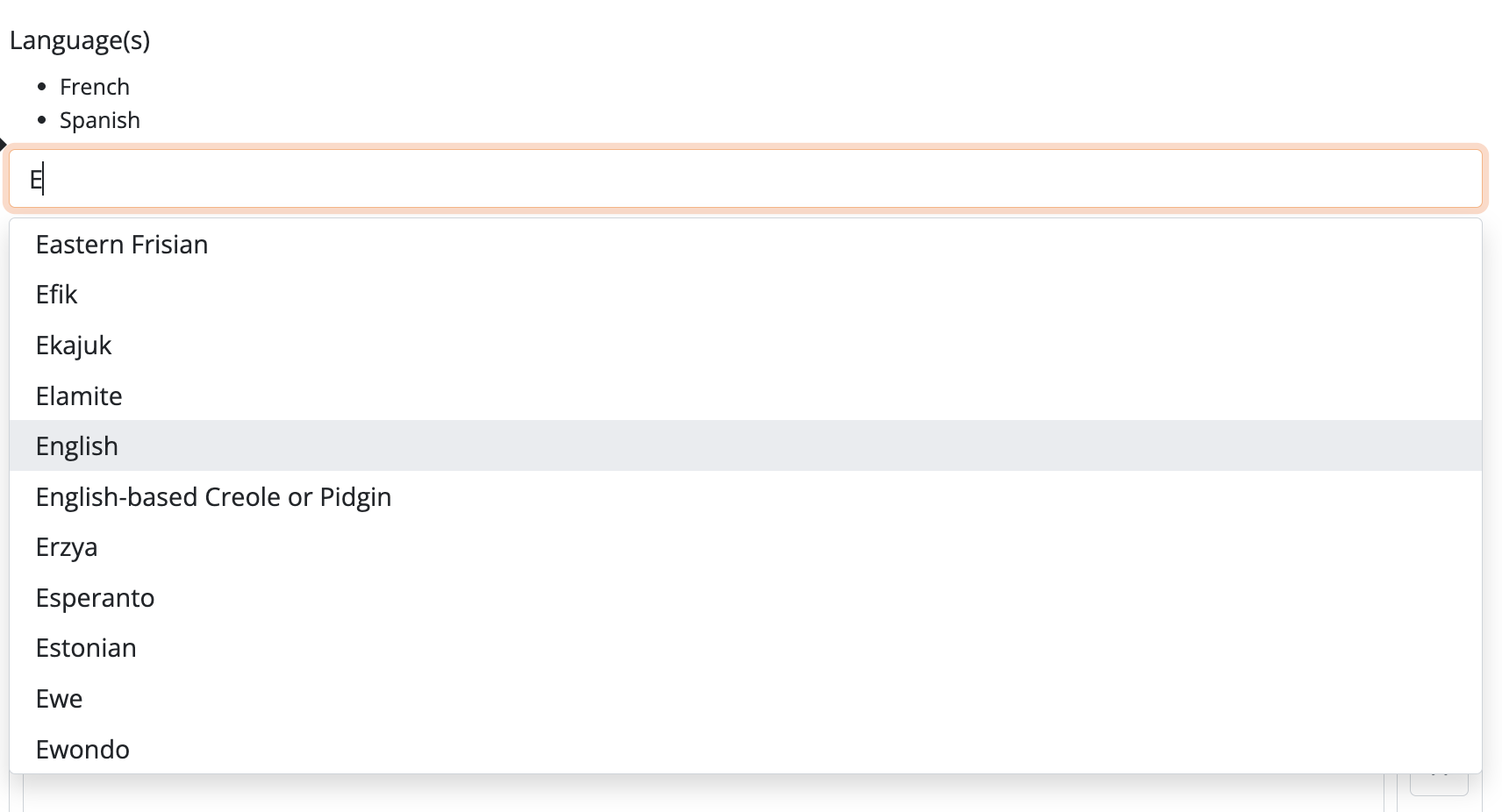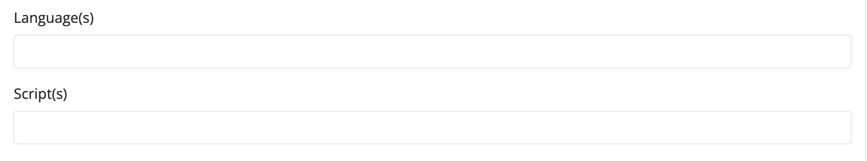 Click on the desired field and begin to type the name of the language or script. AtoM will auto-suggest as you type. When the correct name appears in the field, click on it to add. There is no limit to the number of languages or scripts you can add.